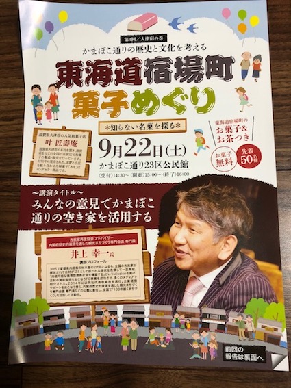 午後は小田原へ 2018年9月23日 ネットワーク 小田原にて 「第4回東海道宿場町菓子めぐり」 〜みんなの意見でかまぼこ通りの空き家を活用する〜 4回目を迎え 「空き家に関して様々な意見」を頂きました。 私は地域活性化は ・ひと(シニアの活躍) ・モノ(空き家活用) ・金(民間の力) なんだと考えています。 住民中心まちづくりの環境づくり・・・ その推進こそが私の使命です。 そして・・必ず「乾杯」します。 この熱く語るのが大事なんです。
