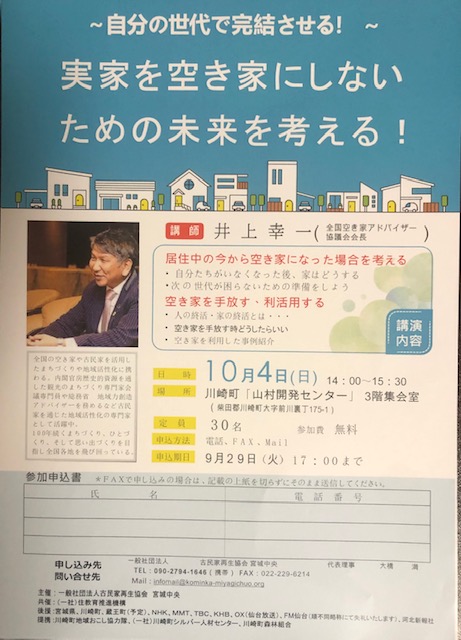 住教育セミナー 2020年10月5日 ブログ 宮城県川崎町にて 〜自分の世代で完結させる〜 【実家を空き家にしないための未来を考える】 川崎町は人口減少・高齢化から「空き家」が増えています。 これは川崎町だけに話ではなく、多くの自治体の抱える問題です。 今月は「住生活月間」 来週は「八女市」再来週は「全国セミナー」 その次の週は「富山」でお話させて頂きます。