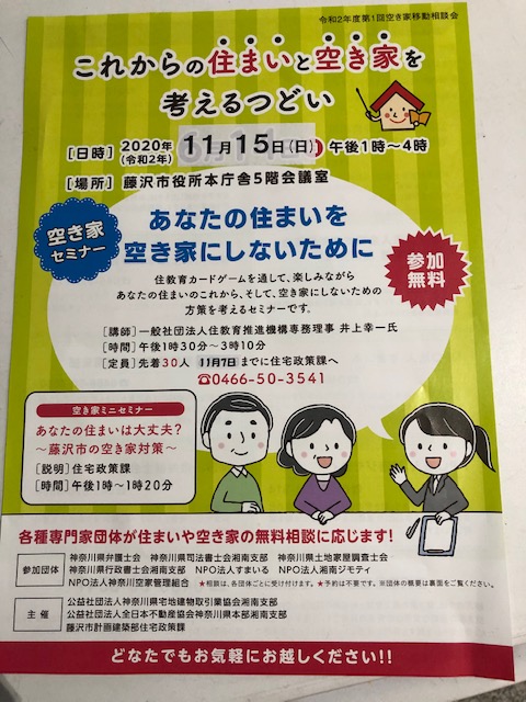 藤沢市で空き家課題解決 2020年11月16日 ブログ 藤沢市での講演 「あなたの住まいを空き家にしないために」 藤沢市民の方にお話をお聞き頂きました。 藤沢市は「10年後に空き家が増えます」 今から「発生抑制対策」をしておくと間に合います。 東京から1時間弱の程々のいい距離で 自然も多く残っている「都市」です。 自治会ごとに 「未来の子ども達の為に危機感を持って望めるか?」 今はそんなチャンスの時期でもありますね。
